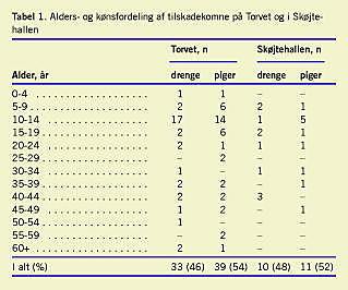 De 72 tilskadekomne på Torvet bidrog med 83 skader i alt. Heraf var 54% kvinder og 46% mænd. I Skøjtehallen var der 21 tilskadekomne med 21 skader. Gennemsnitsalderen her var 21,7 år (7-48 år), 52% var kvinder og 48% mænd (se Tabel 1 ).