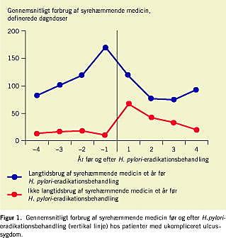 Resultater: I alt 1.024 patienter med kendt ukompliceret ulcussygdom indløste deres første recept på H. pylori- eradikationsbehandling i perioden fra den 1. januar 1992 til den 31. december 1996. Gennemsnitsalderen var 57 år (standard deviation (SD) 18), 59% var mænd. Medianfollowuptid var 5,5 år før og 2,2 år efter den indløste recept. Et år efter H. pylori- eradikationsbehandling var 430 ud af 1.024 (42%) af patienterne i langtidsbehandling med syrehæmmende medicin. Blandt de 453 patienter, som havde været i langtidsbehandling med syrehæmmende medicin det sidste år før H. pylori eradikationsbehandlingen, faldt forbruget af syrehæmmende medicin med 24% efter H. pylori- eradikationsbehandlingen fra 119 til 91 definerede døgndoser (DDD) pr. patient pr. år (difference -28, 95% konfidensinterval (CI) - 8 til - 49; p = 0,008). Til gengæld steg forbruget fra 15 til 41 DDD pr. patient pr. år (difference 26 DDD, 95% CI 16 til 35; p < 0,001) blandt de 571 patienter, der ikke havde været i forudgående langtidsbehandling.