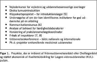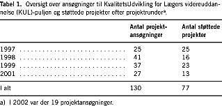 Summary Experiences with a quality improvement fund in the County of Aarhus, Denmark Ugeskr Læger 2004;166:2041-2043 In 1996, the County of Aarhus instituted a fund of 0.7 million euros annually for projects directed toward quality improvement of younger doctors' education. In 1997-2002, a total of 81 projects were funded. Funding appeared to have a positive effect on education by inducing a focus on educational matters. Production demands, however, competed with projects. A lack of systematically collected data made effective evaluations impossible, and prospective investigations into the relationship between economical support and quality of medical education are necessary.