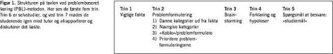 PBL er en studenteraktiverende undervisningsmetode, hvor grupper på 6-8 studerende under vejledning af en tutor foretager problematiseringsproces af en sygehistorie eller andet med efterfølgende selvstudier [3, 12-14]. Tutor skal været trænet i at fungere som facilitator for gruppens læring. PBL-gruppens arbejde styres ud fra syv trin (Figur 1 ) [3, 12, 13]. De studerende anvender de kundskaber, de allerede har, og opstiller spørgsmål til selvstudier (»studiemål«). Efter 5-7 dage med selvstudier mødes PBL-gruppen igen og afstemmer deres nyvundne viden med hinanden og med tutor. Metoden blev udarbejdet i 1960'erne og 1970'erne på hhv. University of McMaster, Canada, og University of Maastrict, Holland. PBL er en internationalt anerkendt pædagogisk metode, og vi har arbejdet med metoden, som den beskrives og praktiseres disse to steder. Med PBL-metoden tilgodeser man vigtige kognitive principper som f.eks. aktivering og uddybning af eksisterende kundskaber samt selvstyret læring [3-5, 8, 9]. Ved PBL arbejdes der på tavle eller whiteboard , og i Figur 1 er tavlens opstilling med de første step 1-5 vist. Som eksempel er der i Figur 2 anført en sygehistorie og en gruppe studerendes studiemål.