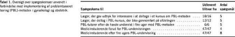 Resultater: Dataindsamling om PBL i studenterundervisningen blev gennemført gennem et år, og det lykkedes at implementere PBL Ingen studerende mente, at afdelingen skulle ophøre med PBL. Sygehistorierne blev af de studerende vurderet som værende relevante for eksamen og for at være læge, og de fleste vurderede, at de læste mere og reflekterede mere ved PBL-metoden. Fire af seks hold vurderede, at PBL-metoden fik dem til at gå mere i dybden med det gynækologisk-obstetriske speciale. To hold vurderede, at det i mindre grad var tilfældet, og det blev vurderet at være pga. hhv. sammenfald med eksamenslæsning og problem mellem PBL-tutor og gruppen. De 12 læger, der deltog i undervisningen om anvendelsen af PBL-metoden, vurderede alle, at kurset var brugbart, og de vurderede PBL som en velegnet pædagogisk metode. Største bekymring var tidsforbrug. De uddannede PBL- tutorer vurderede, at PBL-kurserne gav dem de nødvendige forudsætninger for at varetage tutorfunktionen.