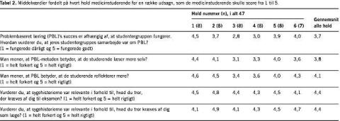 PBL blev gennemført med alle medicinstuderende i løbet af et år, dvs. i alt 47 fordelt på seks hold. Alle studerende besvarede spørgesk emaer anonymt uden PBL-tutors tilstedeværelse.