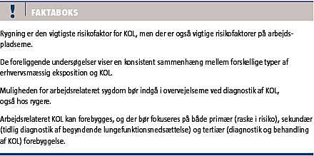 Trods store forskelle i materiale, metoder og valg af slutmål påvises der i de foreliggende undersøgelser en konsistent sammenhæng mellem forskellige typer af erhvervsmæssig eksposition og KOL. Ved brug af anerkendte kriterier for årsagssammenhæng mellem eksposition og sygdom er der derfor tungtvejende evidens for en kausal sammenhæng mellem erhvervseksposition og KOL [23], hvorfor KOL bør betragtes som en potentielt arbejdsbetinget sygdom [24]. Muligheden for arbejdsbetinget sygdom bør derfor altid indgå i vores overvejelser [25], når vi diagnosticerer patienter med KOL, også hos rygere. Arbejdsrelateret KOL kan forebygges, og der bør fokuseres på både primær (raske i risiko), sekundær (tidlig påvisning af begyndende lungefunktionsnedsættelse) og tertiær (diagnostik og behandling af KOL) forebyggelse. Patienter med arbejdsbetinget eller mistænkt arbejdsbetinget KOL samt patienter med arbejdsforværret KOL bør henvises til arbejdsmedicinsk vurdering.