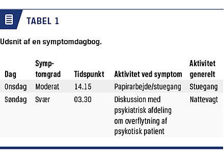 Der var anamnestisk mistanke om, at eksantemet opstod på dage med særlige arbejdsmæssige belastninger. På mistanke om stressurticaria blev der foretaget udredning med symptomdagbog og registrering af potentielt stressende situationer (Tabel 1). Der blev fundet positivt udslag for LEAN-møder (effektiviseringsmøder), visitationsproblemer, ventetidsregistrering og udfyldelse af blebevillinger, men ikke for nattevagter, hjertestopkald og diagnosekodning af epikriser.