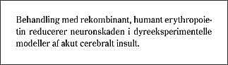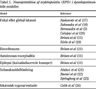 Opdagelsen af et endogent, neuroprotektivt EPO/EPO-R-system har naturligt ledt til spørgsmålet om, hvorvidt en farmakologisk stimulation af systemet vil have en gunstig virkning ved cerebral iskæmi. Flere uafhængige publikationer viser, at rHuEPO har en markant neuroprotektiv virkning i forskellige dyreeksperimentelle modeller af akut cerebral skade (Tabel 1 ). I en model af global cerebral iskæmi hos ørkenrotter reducerede intratekal infusion af rHuEPO celleskaden i CA1-regionen i hippocampus (18) og formindskede tabet af indlæringsevne hos dyrene. Intratekal infusion af rHuEPO reducerede det kortikale infarktvolumen, orienteringsbesvær og sekundær talamisk degeneration efter fokal cerebral iskæmi (5, 17).