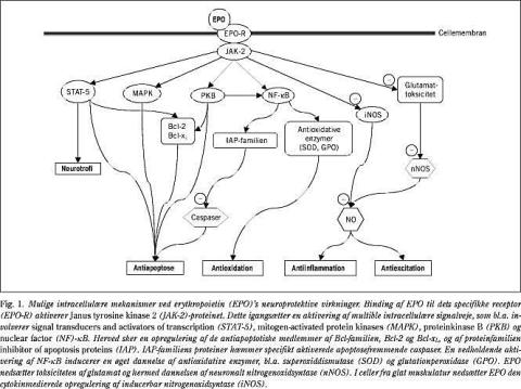 Neural celledød pga. apoptose eller nekrose er resultatet af en kompliceret proces, der omfatter en række intracellulære ændringer i blandt andet pH, ATP- og elektrolytkoncentrationen samt en øget produktion af de cytotoksiske, reaktive iltradikaler NO, superoxid og peroxynitrit (8). Aktiveringen af EPO-R-relaterede signalveje igangsætter tilsyneladende flere potentielt neuroprotektive og antiinflammatoriske mekanismer, som på forskellige niveauer kan hæmme det neuroinflammatoriske respons og efterfølgende apoptose (Fig. 1 ). Hypoksi/iskæmi fører i CNS til øget frigørelse af den eksitatoriske aminosyre glutamat, som via en øget dannelse af NO spiller en afgørende rolle for udviklingen af apoptose (8). Forbehandling med rHuEPO beskyttede hippokampale og kortikale neuroner mod glutamatinduceret celledød på en dosisafhængig måde (10) og medførte en markant reduktion i celledød forårsaget af NMDA (en glutamatreceptoragonist) i en blandet kultur af neuroner og astrocytter fra musens neocortex (5). EPO hæmmer desuden produktionen og aktiviteten af inducerbar NO-syntase og samtidig opreguleres ekspressionen af flere antioxidative enzymer (18, 20, 27-30).