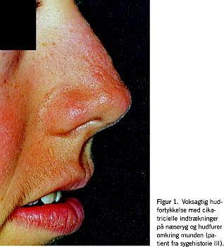 III. En 25-årig mand reagerede i etårsalderen med svie, rødme og hævelse af huden efter soleksponering. Specielt var han generet i foråret og i blæsende efterårsperioder. EPP blev påvist i 17-års-alderen, efter at et familiemedlem havde læst en lignende sygehistorie i Familiejournalen. Patienten havde voksagtige hudfortykkelser på næseryggen med cikatricielle depressioner og hudfurer omkring munden (Figur 1 ). På håndryggene var der stellate, hypopigmenterede cikatricer over knoerne. Betakaroten var kun tilgængeligt i Danmark som håndkøbsmedicin, og den terapeutiske dosis var ca. 25 tabletter dagligt. Efter opnået udleveringstilladelse fra Lægemiddelstyrelsen kunne et højdosis betakarotenpræparat fremskaffes fra Tyskland. Behandlingen blev optitreret til gulfarvning af huden og terapeutisk serum-værdi på mindst 800 μ g/ dl [1].