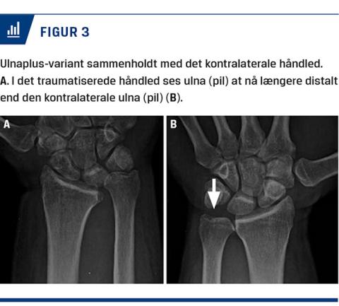 Ved begrundet mistanke om proksimal glidning af radius skal der suppleres med en røntgenoptagelse af håndleddet, der i så fald vil præsentere en vis grad af ulnaplusvariant (Figur 3) og eventuelt en dorsal luksation af ulna.