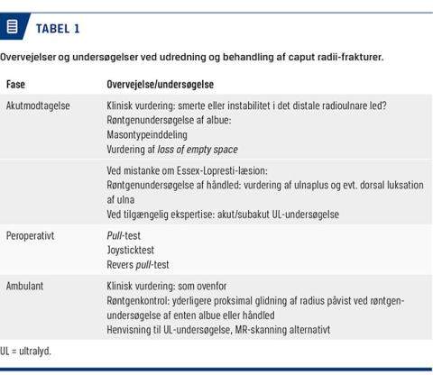 Det foreslås, at en række overvejelser og undersøgelser tilføjes den gængse udredning og behandling af caput radii-frakturer (Tabel 1).