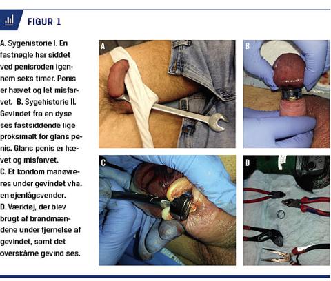 II. En 66-årig mand blev akut indlagt efter et mislykket forsøg på at bruge gevindet fra en dyse på en vandhane som penisring. Gevindet havde sat sig fast lige bag glans, der var voldsomt hævet og let misfarvet (Figur 1B). Metoden, som er beskrevet i sygehistorie I, blev forsøgt (Figur 1C), men mislykkedes, da diameteren af gevindet var meget lille og ikke kunne passere corona glandis. The string method blev ligeledes forsøgt uden held. Det lokale brandvæsen blev tilkaldt og skar to spor i gevindet med en vinkelsliber, mens gevindet blev stabiliseret med skævbidere. Den underliggende hud blev beskyttet af en tungespatel og af konstant køling med en forstøver. Til sidst kunne ringen brækkes af (Figur 1D). Penis var uden tegn på skade eller iskæmi, og patienten kunne udskrives kort efter.