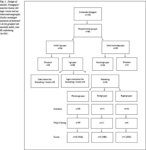 Resultater: I alt 85 mænd (56%) indvilligede i at deltage. Niogtyve blev randomiseret til kontrolgruppen og 56 til I-gruppen. Otte gennemførte ikke testningen efter et år. En motionsgruppe på 29 blev vejledt i aerob fysisk aktivitet tre gange om ugen, en kostgruppe på 11 blev undervist med henblik på at reducere indtaget af mættede fedtsyrer og forøge indtaget af frugt og fisk, og 16 rygere blev anbefalet rygestop. I alt 40 blev anbefalet en eller flere livsstilsændringer, og otte havde ikke behov for ændringer. Blandt de 40 var 34 villige til at forsøge. Sammenholdt med kontrolgruppen steg konditionstallet (p<0,01) og kropsvægten blev mindsket i I-gruppen. HDL-kolesterol steg (p<0,001), og triglyceriderne faldt (p<0,05), men dette var insignifikant i forhold til kontrolgruppen.