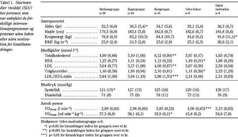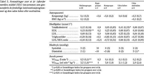 Niogtyve blev anbefalet motion, og alle indvilligede i at forsøge. For at minimere dropout og sikre indpasning i daglige rutiner kunne personerne selv vælge motionsform. Flest valgte jogging som motionsform. I motionsgruppen gennemførte 22 personer (76%) de mål, de havde sat sig. De, som gennemførte interventionen (n=22), forbedrede konditionstallet fra 37,0 til 40,5 ml/min/kg (p<0,01). Tendensen til forbedring fandtes også i HDL (1,24 til 1,36 mmol/l, p=0,06) og i triglycerider (1,50 til 1,21 mmol/l, p=0,09). Sammenholdt med kontrolgruppen var forandringerne ikke signifikante.