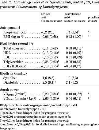 Sammenlignet med kontrolgruppen fandtes over et år forskelle i kropsvægt og konditionstal, når I-gruppen blev analyseret samlet (selv om interventionerne var forskellige) (Tabel 2). Der fandtes også forandringer i blodlipider over tid inden for gruppen, men i forhold til kontrolgruppen var dette ikke signifikant.