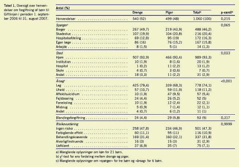 Tabel 1 viser en oversigt over henvendelser vedrørende lægemiddelforgiftninger hos børn. Der var ikke signifikant forskel på antallet af henvendelser angående piger og drenge. I 46,2% af tilfældene stammede henvendelserne fra borgere, mens de øvrige tilfælde stammede fra hospitaler, almen praksis eller lægevagten. I 65% af henvendelserne fra borgerne blev forgiftningen kategoriseret som »ingen risiko«, i 41% som »forbigående«, i 25% som »behandlingskrævende« og kun i 10% som »livstruende«. Langt hovedparten (93,3%) af forgiftningerne fandt sted i eget hjem. Størstedelen af forgiftningerne skete under leg (74,1%), og her var der signifikant forskel i henvendelsesårsagen blandt piger og drenge, idet henvendelser vedrørende piger oftere drejede sig om affekthandlinger/suicidium, end det var tilfældet med drenge. Blandt drenge var forgiftningerne oftere sket under leg. En tredjedel af forgiftningerne (31,8%) blev vurderet som behandlingskrævende og 2,9% som livstruende. I 5,0% af alle forgiftningstilfælde var der tale om forgiftninger med mere end et lægemiddel.
