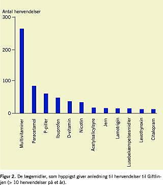 I alt blev der registreret 239 forskellige lægemidler som årsag til forgiftning. Figur 2 viser de 12 hyppigste af disse lægemidler (> 10 henvendelser på et år). I alt 56% af alle henvendelser drejede sig om et eller flere af disse præparater. Indtagelse af multivitaminer var den hyppigste henvendelsesårsag (24,7%), efterfulgt af indtagelse af paracetamol, p-piller, og non-steroide antiinflammatoriske præparater (NSAID).