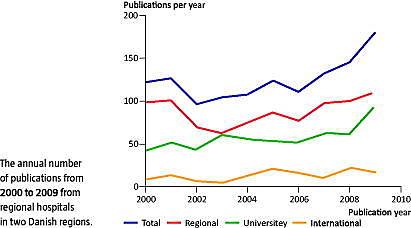 Dansk sundhedsvidenskabelig forskning rangerer højt internationalt. Gøtzsche et al rapporterede i 1995, at 75% af danske sundhedsvidenskabelige publikationer i perioden 1988-1992 kom fra universiteter og universitetshospitaler, mens kun ca. 12% kom fra regionshospitaler. Idet vi ikke har kunnet finde andre eller nyere opgørelser af mængden eller typen af videnskabelige publikationer fra danske regionshospitaler, har vi fundet det relevant at belyse dette område.