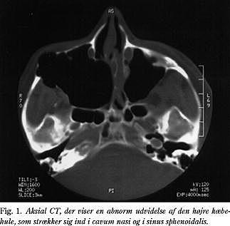 Ved en oftalmologisk undersøgelse fandt man højresidig exophtalmus og hævelse af højre kind. Vores undersøgelse inklusive rinoskopi viste, at lateralvæggen og højre concha media var displaceret ind mod septum og oblitererede højre meatus medius.
