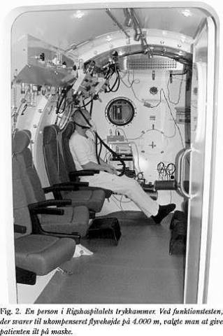 Når man trykkede på højre processus zygomaticus, fremkom der samme lyd, som når man presser bunden ind på en blikdåse. CT og MR-scanning viste abnorm udvidelse af højre sinus maxillaris. Udvidelsen omfattede cavum nasi, sinus sphenoidalis og orbita (Fig. 1 ). Der blev udført funktionel endonasal sinuskirurgi (FESS) i generel anæstesi. Kæbehulens medialvæg, svarende til området over concha inferior, blev reseceret, hvorved et større neoostie til kæbehulen blev dannet. Det bemærkedes, at ved at applicere et tryk mod bulbus oculi sås der i endoskopet tydelig mobilitet af gulvet i højre orbita. En efterfølgende histologisk undersøgelse viste ødem og let metaplasi af sinusmukosa. Ved en ambulant kontrol 15 måneder postoperativt var patienten symptomfri, og man fandt ingen exophtalmus eller hævelse af højre ansigtshalvdel. En CT viste aftagende volumen af højre sinus maxillaris. Da patienten postoperativt havde givet udtryk for betydelig bekymring for fornyede symptomer i forbindelse med planlagte flyrejser, blev han 15 måneder efter operationen udsat for simuleret højdeklima ved at blive anbragt i Rigshospitalets over- og undertrykskammer (Fig. 2 ). Trykket blev reduceret til 0,528 ATA, svarende til en ukompenseret flyvehøjde på 4.000 meter. Der konstateredes herved fuldstændig trykudligning i sinus, idet patienten ikke havde symptomer under testen.