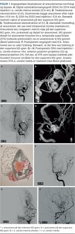 En 29-årig mandlig ryger med hyperkolesterolæmi og Arnold-Chiaris malformation fik i 2014 påvist to aneurismer på venstre a. cerebri media (MCA) beliggende efter MCA’s første deling (M2-grene) (Figur 1A+B). Begge målte 10 mm i største diameter og var beliggende på hhv. superiore og inferiore M2-gren. Aneurismet på den superiore M2 var fuciformt (involverede > 50% af karrets cirkumferens). Pga. aneurismernes størrelse og patientens unge alder anbefalede man lukning for at forebygge ruptur og subaraknoidalblødning.