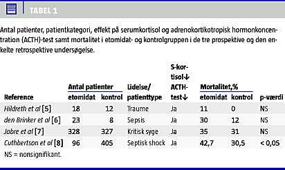 Mens etomidat således ikke syntes at have væsentlige bivirkninger hos forholdsvist raske operationspatienter, er der inden for de seneste år fremkommet flere artikler, som tyder på, at selv en enkelt bolusdosis etomidat ikke alene medfører et abnormt ACTH-respons i flere døgn, men også er associeret til øget morbiditet og mortalitet (Tabel 1 ).