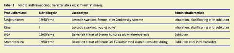 På verdensmarkedet findes der fire anthraxvacciner, der dog på grund af producentlandenes forsvarspolitiske hensyn ikke alle er kommercielt tilgængelige (Tabel 1 ). Den engelske og den amerikanske vaccine er stort set identiske. Den russiske og den kinesiske vaccine menes begge at være levende vacciner baseret på Sterne-stamme-varianter (veterinær vaccinestamme). Immuniseringsregi menerne varierer betydeligt, og argumentationen for de forskellige strategier synes at være uklar. Vaccinerne er alle udviklet i 1960'erne og har siden stort set ikke været modificerede, hvilket til dels også gælder for immuniseringsregimenerne. Vaccination er traditionelt anvendt til dyr og personer med erfaringsmæssig høj erhvervsbetinget eksponeringsrisiko. Vaccination anvendes til obligatorisk immunisering af soldater i det amerikanske forsvar, hvilket har ført til en debat om vaccinens sikkerhed og bivirkninger [2, 3]. Der er af russiske forskere til militære formål udviklet aerosoliserede vaccinevarianter, der er resistensmodulerede, så de tåler anvendelse sammen med antibiotikaprofylakse [4].