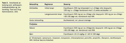 Som profylakse for militært personel, prøvetagningshold og muligt ekponerede personer anvendes som førstevalg ciprofloxacin evt. kombineret med et andet antibiotikum. Behandling af de eksponerede fortsættes i minimum 60 dage, hvilket stiller betydelige logistiske krav til myndigheder og militære enheder i tilfælde af masseeksponering. Ved manifest sygdomsudbrud bør der vælges intravenøs kombinationsantibiotikabehandling (Tabel 2 ), hvilket efter de seneste begrænsede amerikanske erfaringer medfører en dødelighed på ca. 50%, afhængig af interventionstidspunktet [5].