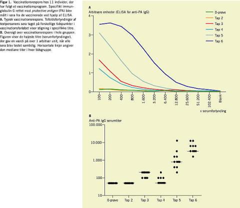 Elleve personer med tilknytning til Center for Biologisk Beredskab blev fulgt over 18 måneder i forbindelse med anthraxvaccination. Immunisering blev foretaget med UK cell free, Anthrax Vaccine Precipitated, AVP, et sterilt cellefrit mikrofiltrat indeholdende en blanding af bakterielle produkter, herunder de vigtigste immunogene faktorer, protective antigen (PA) og mindre mængder af lethal factor (LF) og edema factor (EF). Immuniseringen gennemførtes ved intramuskulær injektion af 1 ml vaccine i regio deltoidea med intervaller efter anbefaling af producenten. I forbindelse med hver vaccination sikredes sera til at teste immunglobulin G (IgG)-vaccinationsresponset.