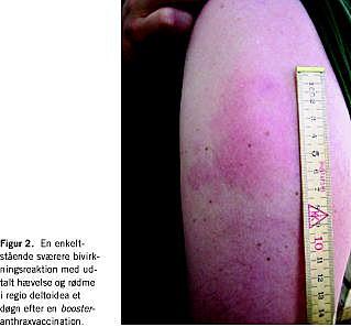 Vaccination kan medføre influenzalignende symptomer og betydelig lokal muskelømhed, der fører til hel eller delvis ukampdygtighed i op til et døg n, hvilket er af betydning blandt andet for militær operationsplanlægning af indsættelseshold. Incidencen af systemiske bivirkninger opgøres i store amerikanske og britiske studier til at være på under 1% med en signifikant vaccine-batch -afhængighed. Lette bivirkninger i form af lokal muskelømhed, hævelse og rødme (Figur 2 ) findes i flere studier at forekomme hos ca. 15% af de vaccinerede. Lokale eller systemiske symptomer fører til midlertidig nedsat arbejdsevne hos 3-5% af de vaccinerede [3, 7].