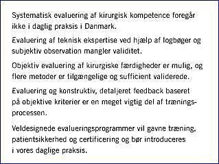 I dag foregår evaluering af de manuelle færdigheder oftest ved, at der i en logbog registreres alle indgreb udført af den uddannelsessøgende læge. Den evaluering er officielt accepteret, når en uddannelsessøgende læge søger fase II-stilling eller godkendelse af speciellægeuddannelsen. Logbogen indeholder ingen information om kvaliteten af den udførte procedure og sikrer ikke, at kirurgen er i stand til at operere selvstændigt. Der er generel enighed om, at logbøger ikke er et optimalt evalueringsværktøj, da de mangler validitet og reliabilitet [3]. Der er i den seneste tid advokeret for (mest fra mediernes side), at evaluering af kirurgisk operativ kompetence kan foregå ved registrering af morbiditet og mortalitet i forbindelse med kirurgiske indgreb. Disse parametre er dog i betydelig grad påvirket af mange patient- og miljørelaterede faktorer, og deres værdi i evalueringen er meget begrænset [4]. I modsætning til i mange andre lande (Fellowship og Membership of the Royal College of Surgeons, American Board of Surgery in Training Exam, etc.) sker der i Danmark ingen formel evaluering af kirurgens teoretiske viden, før vedkommende får tilladelse til at praktisere som specialist i faget.