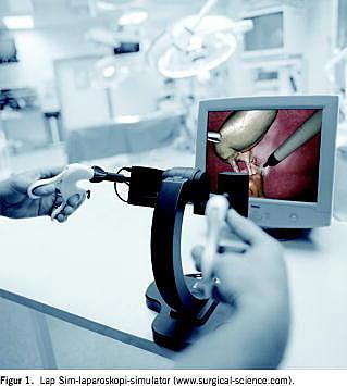 Virtual reality-simulation har været i brug til træning og evaluering af kompetence i flyindustrien og militæret i mange år. Computerudviklingen i de seneste år har gjort det muligt at producere systemer, med hvilke man kan måle kirurgisk præstation kvantitativt og fuldstændigt objektivt. Et af de kommercielt tilgængelige systemer, Minimally Invasive Surgical Trainer - Virtual Reality, Mentice Medical Simulation (MIST-VR), Göteborg, Sverige, er initialt designet til at simulere de basale færdigheder, som bruges til at udføre laparoskopisk kirurgi med. Systemet beregner performance score , baseret på tre parametre - tidsfaktor, antal fejl og antal unød vendige bevægelser. MIST-VR er grundigt valideret i flere studier som et objektivt og validt værktøj, som kan anvendes til evaluering af laparoskopiske psykomotoriske færdigheder [10]. Der findes i øjeblikket andre, meget lovende systemer (LapSim, Surgical Science, Göteborg, Sverige), som kan simulere ikke kun basale laparoskopiske opgaver, men også virtuelle procedurer (laparoskopisk kolecystektomi, gynækologiske procedurer etc.) (Figur 1 ). Validiteten af systemet er dog ikke sufficient undersøgt endnu, og flere igangværende studier har til formål at afklare LapSims værdi som evalueringsværktøj.