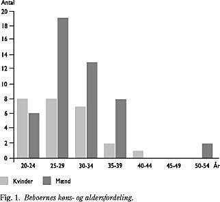 Fra 1980 til 1988 udgjorde kvinderne 28%. Fra 1988 til 1994 var 43% af beboerne kvinder. Gennemsnitsalderen ved indflytningen i perioden 1988-1994 var 29,5 år, mens den fra 1980 til 1988 var 28,7 år. Køns- og aldersfordelingen ses i Fig. 1. Mændenes gennemsnitsalder (30,4 år) var lidt højere end kvindernes (28,2 år).