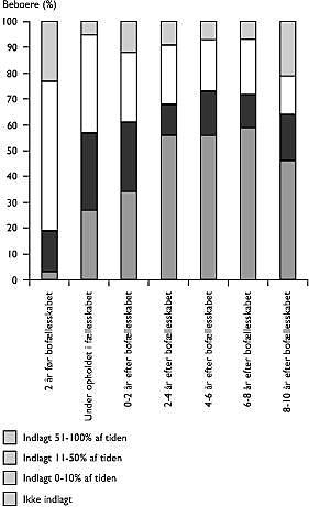 Før indflytning i bofællesskab var beboerne i gennemsnit indlagt 32% af dagene i de foregående to år. Under opholdet var den gennemsnitlige indlæggelsesprocent 14. Gennem de følgende ti år var alle beboerne i gennemsnit indlagt 14% af tiden. Fordelingen af indlæggelsesdage på antal beboere er vist i Fig. 2.
