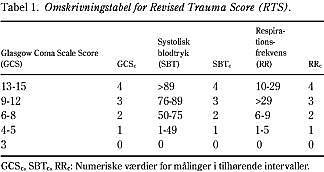 De absolutte værdier af variablerne omskrives til en værdi (Tabel 1 ) og indgår derefter i beregningen som vist i Tabel 2 . A1-3 er koefficienter, der er udregnet ved logistisk regression. Vægtningen af de tre variabler er forskellig som udtryk for, at fx den intrakraniale læsion målt ved Glasgow Coma Scale Score har større indflydelse på overlevelsen end respirationsfrekvensen. RTS har således værdier mellem 0 og 7,8408, hvor højere værdier angiver højere sandsynlighed for overlevelse og dermed mindre fysiologisk skade. Abbreviated Injury Scale (AIS) (8) blev anvendt til beskrivelse af den anatomiske skade. AIS er et katalog over flere hundrede læsioner, inddelt i ni kropsregioner, hver læsion er tildelt en værdi mellem 1 og 6 til at beskrive alvorligheden af den anatomiske skade. Værdien 1 angiver en mindre skade fx en hudafskrabning eller en distorsion, mens værdien 6 angiver en dødelig læsion fx overrivning af hjernestammen. Registreringen af AIS blev foretaget af meget få personer, alle med lang erfaring med denne kodepraksis.