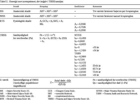 b0...3 er koefficie nter, der fremkommer ved regressionsanalyse af større traumepopulationer. De første koefficienter blev beregnet fra MTOS i USA (10), men i Storbritannien har man gennem de senere år udviklet sin egen traumedatabase, hvor hospitaler både i og uden for landet kan deltage. Den er organiseret under navnet The Trauma Audit and Research Network (TARN). I TARN anvendes TRISS-metoden, således som oprindeligt beskrevet, men man anvender koefficienter, der er beregnet ved regressionsanalyse af egne data (11).