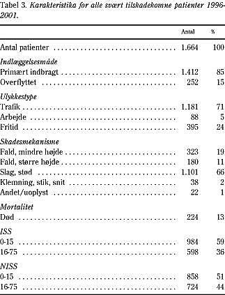 Resultater: I alt 598 (36%) patienter havde ISS >15, og 71% kom fra trafikuheld. Den samlede mortalitet var 13%, og ved beregning af overlevelsessandsynlighed fandtes en signifikant lavere mortalitet end i amerikanske og engelske traumedatabaser trods sammenlignelig traumealvorlighed.