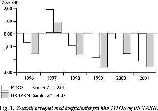 TRISS-analysen udført mod det amerikanske MTOS og TARN fra Storbritannien er vist i Fig. 1 både hvert år for sig og den samlede værdi for hele materialet. I 1997 døde der flere end forventet, men forskellen var ikke signifikant. I 1999 og 2001 var der derimod signifikant færre døde end forventet, ligesom der i det samlede materiale var signifikant færre døde i vores materiale end forventet ud fra MTOS- og TARN-data. Der syntes at være en tendens til, at overlevelsen hos svært traumatiserede patienter i vores materiale bedres henover perioden.