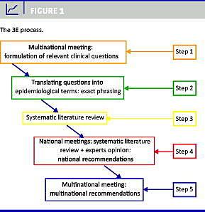 På det første møde i processen deltog 17 lande med hver en videnskabelig komite bestående af 5-16 reumatologiske speciallæger (Figur 1). Ved en Delphiafstemningsproces blev der formuleret en række spørgsmål med relevans for daglig klinisk praksis. Internationale litteratursøgere dokumenterede den videnskabelige evidens inden for hvert spørgsmål ved systematisk litteratursøgning. I anden runde blev der i hvert deltagerland afholdt et møde, hvor nationale anbefalinger blev udarbejdet. Samtlige danske reumatologiske speciallæger (n = 206) blev inviteret til det danske møde, som fandt sted i januar 2008. På basis af den præsenterede 3E-proces, evidensen og deltagernes kliniske erfaringer blev der i grupper udarbejdet forslag til en anbefaling for hvert spørgsmål. Forslagene blev diskuteret i plenum, og ved en efterfølgende Delphiafstemning blev det besluttet, hvilke formuleringer, der skulle udgøre de danske anbefalinger. Endelig blev deltagerne bedt om at gradere deres enighed med anbefalingerne. På et tredje og afsluttende multinationalt møde med deltagelse af de videnskabelige komiteer blev der på basis af de nationale anbefalinger, diskussioner og Delphiafstemninger udarbejdet et fælles sæt multinationale anbefalinger. I februar 2009 blev et spørgeskema vedrørende disse fælles anbefalinger udsendt til alle reumatologiske speciallæger i Danmark. Graden af enighed skulle angives på en numerisk skala på 0-10, og spørgsmål vedrørende implementering skulle besvares.