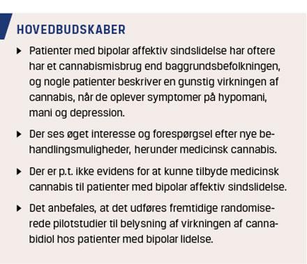 Bipolar affektiv sindslidelse (BAS) er en alvorlig, episodisk sygdom med en ofte nedsat psykosocial funktion, nedsat arbejdsevne og øget komorbiditet. Specielt ses der misbrug af alkohol (42%) og euforiserende stoffer, hyppigst cannabis (20%) [1]. Den anbefalede medicinske behandling af BAS er stemningsstabiliserende lægemidler, hvor lithium, quetiapin og lamotrigin er de hyppigst anvendte [2]. Det skønnes, at ca. en tredjedel af patienterne kun har delvis eller manglende virkning af den medicinske behandling [3]. F.eks. har lithium, trods en god effekt, et snævert terapeutisk indeks og en række bivirkninger, så op til 50% af de patienter, der er i lithiumbehandling, afslutter behandlingen inden for et halvt år [4]. Således er der brug for flere behandlingsmuligheder, og blandt disse spørger patienter og deres pårørende, om medicinsk cannabis er en mulighed.