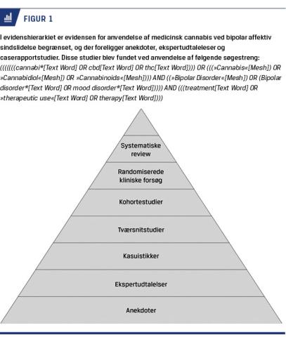 (Figur 1).Da der ikke blev fundet randomiserede, blindede forsøg, blev databasen Clinicaltrials.gov gennemgået for registrerede, planlagte, igangværende og afsluttede kliniske studier. Der blev fundet et studie, der var registreret i november 2006 fra University of British Columbia, formålet var: »to determine whether a standardized plant extract of cannabis containing a 1:1 ratio of THC & CBD can alleviate bipolar mood symptoms unresponsive to standard treatment«. Studiet blev ikke igangsat, og ingen patienter blev inkluderet.