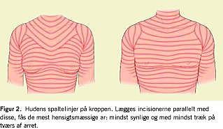 Tegn, før der skæres! Optegn så vidt muligt de planlagte incisionslinjer i hudens rynkeretning, Det giver de mindst iøjnefaldende cikatricer og mindst stramning ved lukning (Figur 1 , Figur 2 og Figur 3 ). Hvis der anvendes ellipseformet excision med længde ca. fire gange bredde, undgås »hundeører« (Figur 4 ). I de optegnede incisionslinjer lægges infiltra-tionsanæstesi. Intradermal anæstesi giver i praksis øjeblikkelig anæstesi i huden. Ved indgreb perifert eller i ansigtet kan det ofte være en fordel først at lægge ledningsblok. Et ledningsblok lægges så tidligt i forløbet som muligt, da det kræver nogle minutter for at virke. Den samme forsinkelse gælder for vasokonstriktorer!