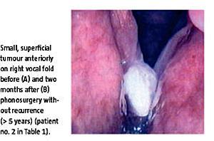 Fonokirurgisk excisionsbioptering med mikroinstrumenter kan således fjerne overfladiske T1a-glottiscancere, men resultatet er langt fra de 95-98% helbredelse, der opnås ved strålebehandling eller mere aggressiv laserassisteret fonokirurgi med kurativt sigte. Da mere end halvdelen af vore patienter imidlertid ikke havde behov for yderligere behandling, kan det i særlige tilfælde − hvor tumor skønnes fjernet, og yderligere behandling ikke er ønskværdig − være acceptabelt at se tiden an, såfremt patienten følges med tæt videostroboskopisk kontrol, specielt i det første år.