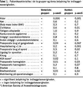 Ved multivariatanalyse fandtes kun to patientkarakteristika af betydning for indlæggelsesvarigheden i hver gruppe: alder og ASA-score i ventelistegruppen, alder og blodtransfusion i kontrolgruppen. Alder forklarer derfor de fleste bivariate relationer.