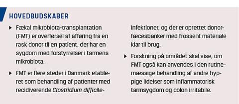 lægevidenskab i de seneste år, er det ikke nogen ny behandling. Allerede i det fjerde århundrede blev FMT beskrevet inden for kinesisk medicin og fra det 17. århundrede inden for veterinærmedicin. I 1958 beskrev en amerikansk mave-tarm-kirurg, hvordan fire patienter med pseudomembranøs kolitis – en betændelsestilstand i colon der i dag er en kendt manifestation ved Clostridium difficile-infektion – blev kureret vha. FMT [1]. Over de seneste 10-20 år er der sket en stor udvikling i vores viden om tarmens mikrobiota og dens betydning. Denne udvikling har været betinget af store fremskridt inden for metoder til identificering af mikroorganismer. Tidligere var identifikationen udelukkende baseret på dyrkning, men nu er det blevet muligt at anvende avancerede DNA- og RNA-baserede teknikker, hvormed man ikke bare kan identificere mikroorganismerne, men også deres funktioner. Store projekter som det amerikanske Human Microbiome Project og det europæiske MetaHIT har gjort det muligt at kortlægge mikrobiomet og påvise mulige sammenhænge med sygdomme og tilstande som f.eks. fedme [2].