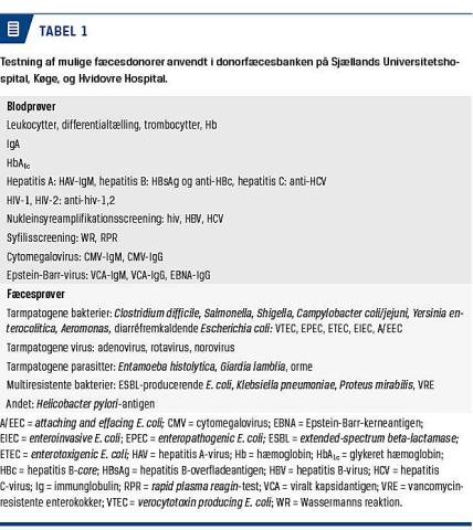 I en europæisk konsensusrapport om klinisk anvendelse af FMT [5] anbefales det, at donorerne udvælges på baggrund af grundige oplysninger om tidligere sygdomme, gastrointestinale symptomer og lidelser, risikofaktorer for overførsel af infektionssygdomme og forbrug af medicin, der kan påvirke tarmens mikrobiota. Potentielle donorer skal testes i form af både blodprøver og fæcesprøver (Tabel 1).