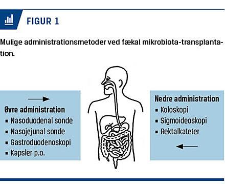 FMT kan indgives på flere måder (Figur 1). Administrationsmetoderne har forskellige fordele og ulemper, men ser alle ud til at være effektive. I en metaanalyse har man fundet en lidt højere effekt ved applicering med koloskop [6], men kun i et enkelt forsøg med 20 deltagere har man sammenlignet metoder direkte, og her har man ikke kunnet påvise en signifikant forskel mellem koloskopi og nasogastrisk sonde [7]. I en spørgeskemaundersøgelse blandt ambulante patienter var nedre administration det foretrukne, men også perorale kapsler var attraktive [8]. Valget af metode beror således primært på tilgængelighed og holdning.