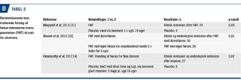 Der er til dato publiceret tre dobbeltblindede, randomiserede kontrollerede forsøg med FMT til behandling af colitis ulcerosa [4, 21, 22]. I to af disse forsøg påviste man en gavnlig effekt af FMT i forhold til placebo, mens man i det sidste ikke kunne vise nogen signikant forskel på behandling og placebo (Tabel 2).