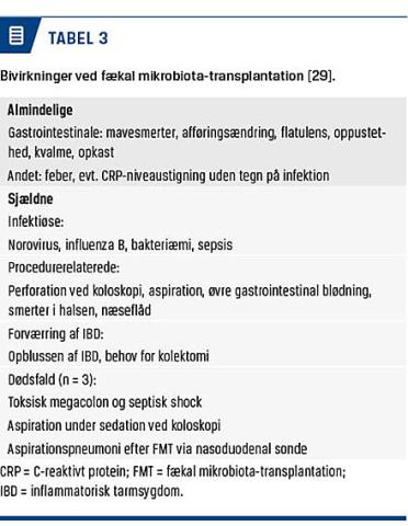 Efter at have fået FMT beskriver mange af patienterne, at de har milde gastrointestinale bivirkninger i det første døgn. Der er dog også beskrevet mere sjældne alvorlige tilfælde af mulige bivirkninger af FMT (Tabel 3) [29].