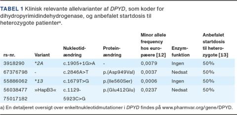 Den hyppigste årsag til nedsat DPD-aktivitet er enkeltnukleotidmutationer (SNP) i DPYD, der koder for DPD. De fleste er funktionelt betydningsløse, men enkelte ændrer mængden eller aktiviteten af DPD. Patienter kan være heterozygote, homozygote eller dobbelt heterozygote for en række DPYD-allelvarianter [9], hvoraf mere end 120 er beskrevet [10], og potentielt klinisk relevante kommer stadig til [11]. De fleste er inaktiverende, men enkelte øger DPD-aktiviteten [10]. I Tabel 1 vises klinisk relevante varianter, hvis association til 5-FU-toksicitet er veldokumenteret [14, 15]. Alle er inaktiverende, og bærere har nedsat clearance af 5-FU. rs3918290 (*2A)er den mest udforskede, og heterozygote bæreres 5-FU-clearance er omtrent halveret, mens homozygotes clearance vil være ekstremt lav [16]. I den nyeste guideline fra Clinical Pharamcogenetics Implementation Consortium angives også haplotypen HapB3 som klinisk relevant [12].