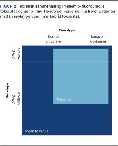 Fluoropyrimidinlægemidler (FP), bl.a. 5-fluorouracil (5-FU) samt capecitabin og tegafur, der metaboliseres til 5-FU, er antimetabolitter og centrale i den kemoterapeutiske behandling af solide tumorer, f.eks. kolorektal-, bryst-, pancreas-, hoved-hals- og øsofagus-/ventrikelcancer. Ca. 5.000 danske patienter behandles årligt med FP. Capecitabin og tegafur gives peroralt. 5-FU kan administreres både som bolus og som kontinuerlig infusion over dage eller uger, og bivirkningsprofilen afhænger af dosis og regime. Enkelte patienter har øget risiko for svær toksicitet pga. nedsat eller komplet mangel på funktion af enzymet dihydropyrimidindehydrogenase (DPD), der nedbryder både endogene pyrimidiner og 5-FU. Derfor anbefalede både European Medicines Agency og Lægemiddelstyrelsen i foråret 2020 at foretage fænotype- og/eller genotypebestemmelse før den første behandling med FP [1], men det er omdiskuteret, hvilken teststrategi der er den optimale. I denne artikel gives der en status på området. For en detaljeret gennemgang af de underliggende studier henvises til Knikman et al [2].