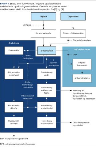 FP’s metabolisme er kompliceret (Figur 1). DPD-katalyseret omdannelse af 5-FU til inaktive metabolitter er den centrale, hastighedsbegrænsende proces [3], der omsætter 70-90%. Den resterende del omsættes ved anabole processer til aktive metabolitter, som medierer den cytotoksiske effekt [5]. Hos kaukasider findes der nedsat DPD-aktivitet hos ca. 10% og komplet DPD-mangel hos mindre end 1% [6, 7]. Prævalensen i den danske befolkning er ukendt. Hvis disse patienter får standarddosering, vil de eksponeres for højere koncentrationer af 5-FU og have en øget risiko for alvorlige bivirkninger og letalitet [8].